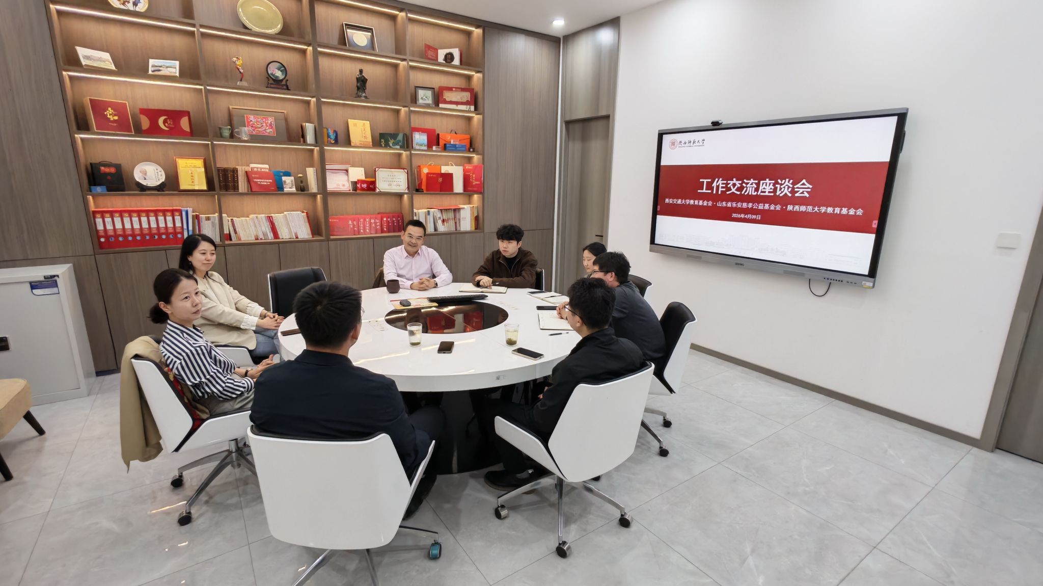 4 月 9 日,西安交通大学教育基金会、山东省乐安慈孝公益基金会及滨州市稷下学宫产教融创研修中心一行莅临我基金会交流座谈,共商教育公益合作发展大计。基金会秘书处副秘书长杨孝峰主持会议,西安交通大学教育基金会秘书长助理毛珊,山东省乐安慈孝公益基金会副秘书长张璇、项目主管刘文林,滨州市稷下学宫产教融创研修中心总经理张荣川等参加座谈。