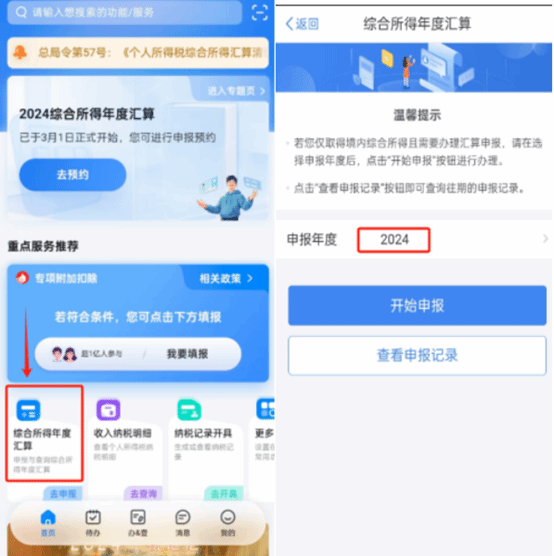 在首页的点击【综合所得年度汇算】综合所得年度汇算页面,在申报年度中选择【2024】年度。