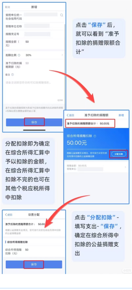 分配扣除即为确定在综合所得汇算中予以扣除的金额,在综合所得汇算中扣除不完的也可在其他个税应税所得中扣除点击“分配扣除”-填写支出-“保存”,确定在综合所得中扣除的公益捐赠支出。
