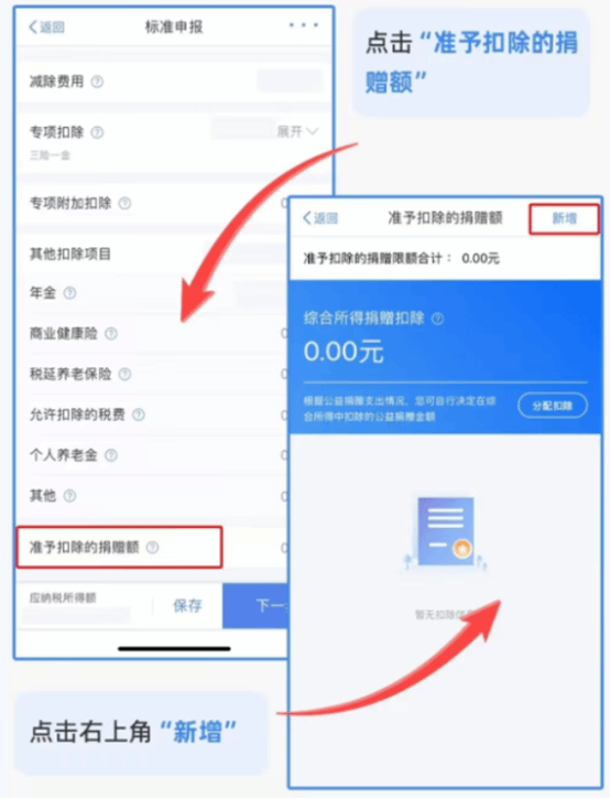 1.按照提示如实填写捐赠相关信息,包括受赠单位统一社会信用代码、捐赠凭证号、捐赠金额等,并选择扣除比例。