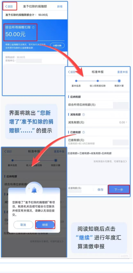 对“综合所得捐赠扣除”金额确认无误后点击“返回”,再点击“下一步”界面将跳出“您新增了‘准予扣除的捐赠额’…”的提示,阅读知晓后点击“继续”进行年度汇算清缴申报。